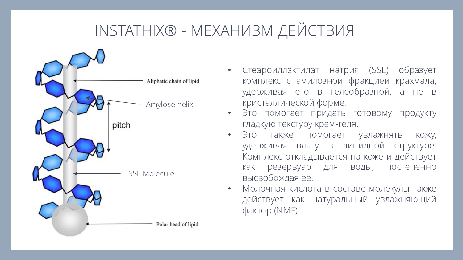 Instathix® представляет собой концентрированную порошковую смесь натуральных эмульгаторов, стабилизаторов и модификаторов текстуры, позволяющую легко получать стабильные эмульсий типа "масло-в-геле". С ним можно создавать как жидкие сыворотки с шелковистой гладкой текстурой, так и более насыщенные и густые кремы и баттеры. Кроме того, этот ингредиент можно использовать для решения проблем, связанных с повышением вязкости или улучшением стабильности и текстуры уже готовых рецептур.